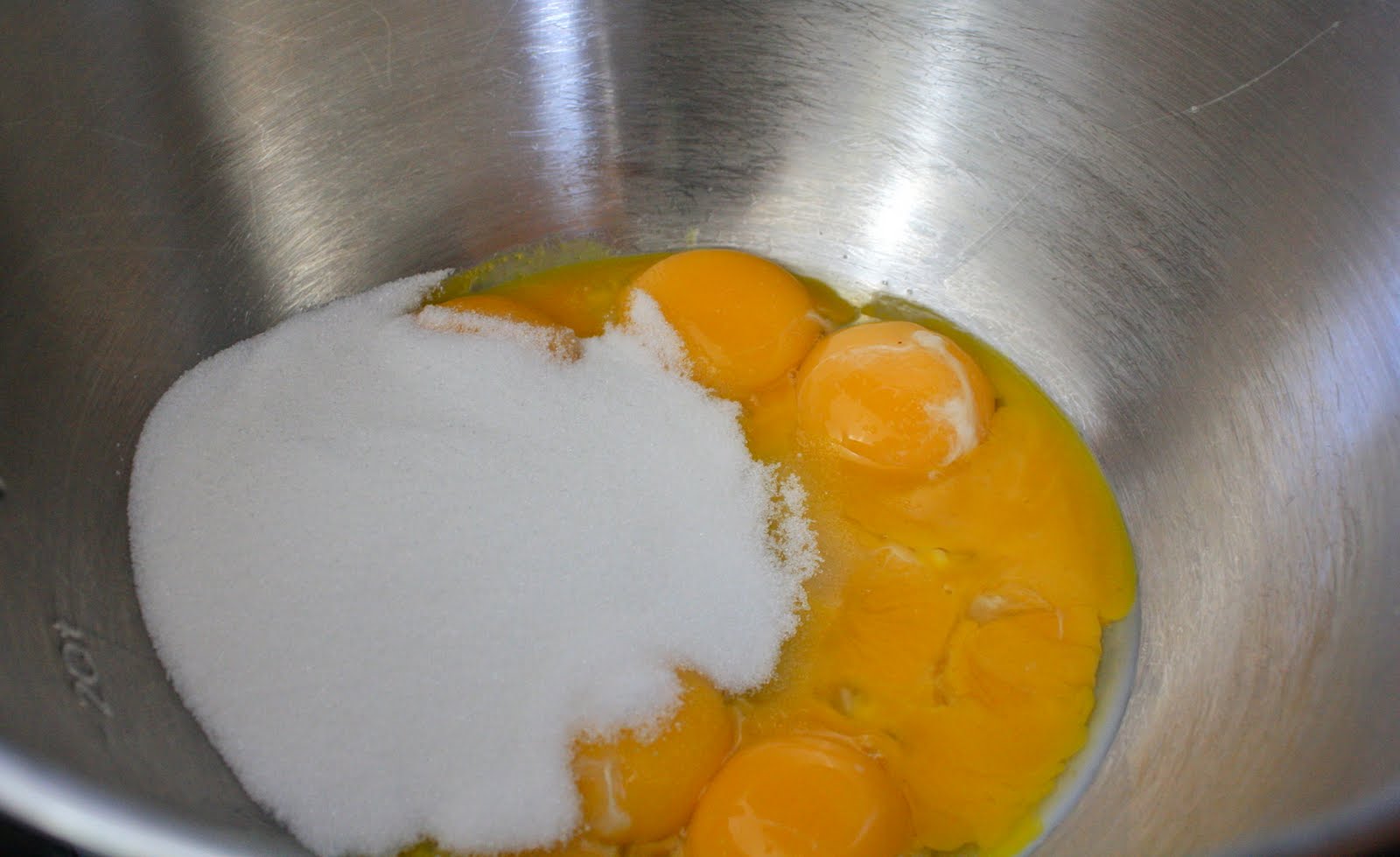 Separate the 8 eggs and place the yolks in the metal bowl on stove as well as sugar, marsala, and pinch of salt.